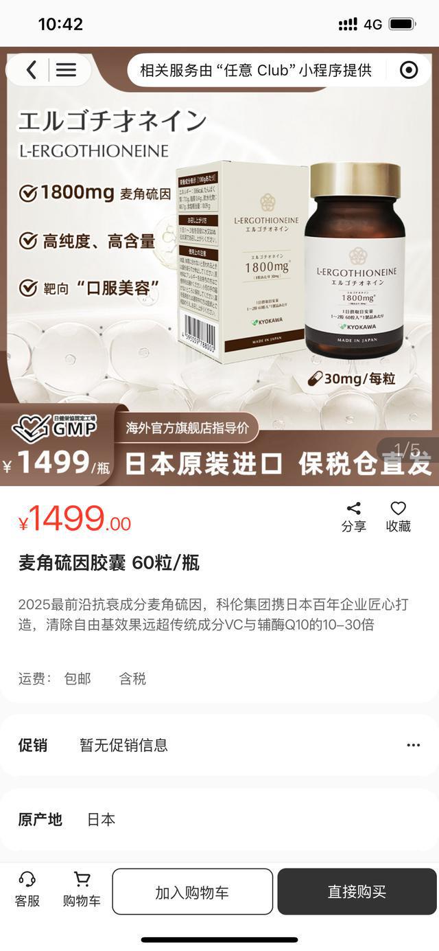 从微信号“科伦永年大健康”提供购买的小程序可以看到,上述视频宣传产品——麦角硫因胶囊在售版本定价1499元/瓶(60粒),每粒含30mg(毫克)麦角硫因。产品宣传称其“清除自由基效果远超传统成分VC与辅酶Q10的10至30倍”,由“科伦永年携手日本老牌药企强强联合推出”。