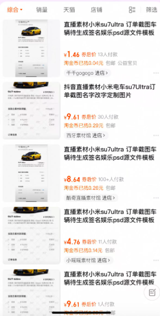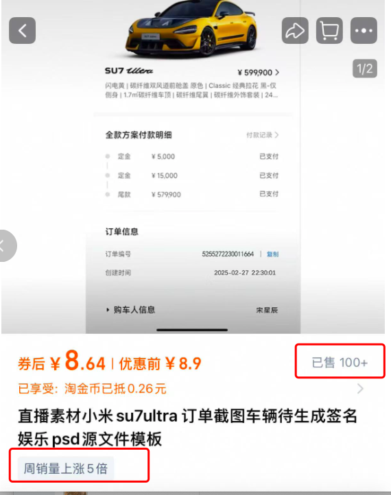 汽车订单截图售卖成生意:小米SU7 Ultra订单截图标价9.9元,还有人卖提车仪式图、方向盘图