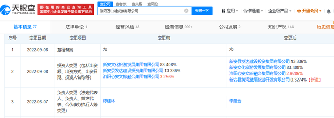 天眼查APP显示,万山湖公司最新工商变更出现在2022年9月,新安县黄河黛眉旅游开发有限公司为新进股东,持股0.3274%,洛阳心安文旅融合集团有限公司持股比例由3.256%降低至2.9286%。