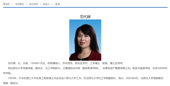 履历显示,范代娣今年59岁,本科毕业于西北大学化工系,1994年于华东理工大学生物工程系博士毕业后进入西北大学工作,历任化工学院副院长、院长。2025年4月,任西北大学党委委员、常委、副校长。