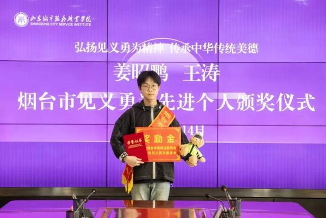 14日上午,山东烟台市委政法委、烟台市见义勇为基金会向姜昭鹏、王涛颁发“烟台市见义勇为先进个人”证书并给予现金奖励。