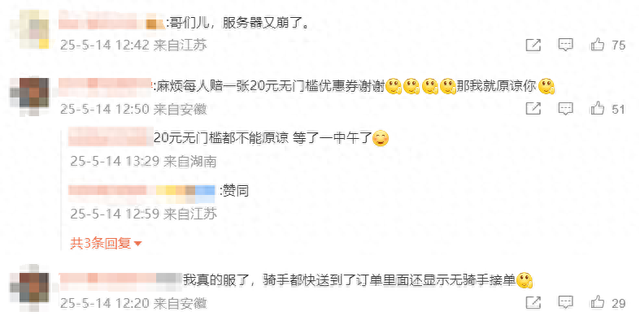 另有网友表示“等了一中午了”,希望“赔付一张20元无门槛优惠券”。