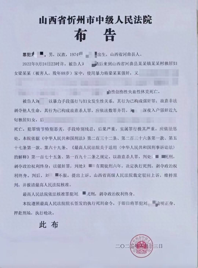 5月14日,红星新闻记者致电山西省忻州市中级人民法院刑事审判庭,工作人员证实该布告属实,为忻州中院所发。罪犯刘某某已被执行死刑。