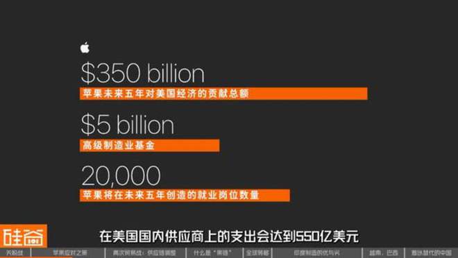 除了前文提到的奥斯汀工厂以外,苹果也是下了血本,承诺对美国制造业的投资,并创造就业机会。苹果保证,2018年在美国国内供应商上的支出将会达到550亿美元,并在五年内创造超过2万份工作。