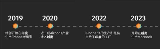 一些重要里程碑事件包括:2019年纬创开始在印度生产iPhone老机型;2020年近三成Airpods产能迁入越南;2022年,苹果将iPhone 14的生产和组装也交给了印度的工厂,这是苹果第一次在中国以外生产最新的机型。此后一年不到,苹果开始在越南生产MacBook。