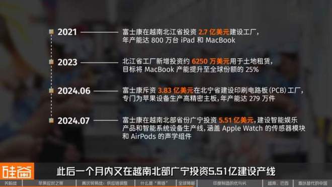比如富士康就是转移比较快的公司:2021年,富士康在越南北江省投资2.7亿美元建设工厂,生产iPad和Macbook,并在2023年扩建该工厂。2024年6月,富士康斥资3.8亿美元在北宁省建设工厂,专门为苹果设备生产高精密主板,此后一个月内又在越南北部广宁投资5.51亿建设产线,生产Apple Watch和AirPods组件。