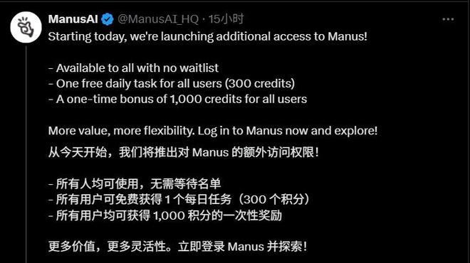 5月12日晚上11点,Manus发布公告表示,Manus即日起向所有人开放,无需等待;所有用户将一次性获得1000积分奖励,同时,用户每天还能免费获得300积分(相当于一次使用机会)。