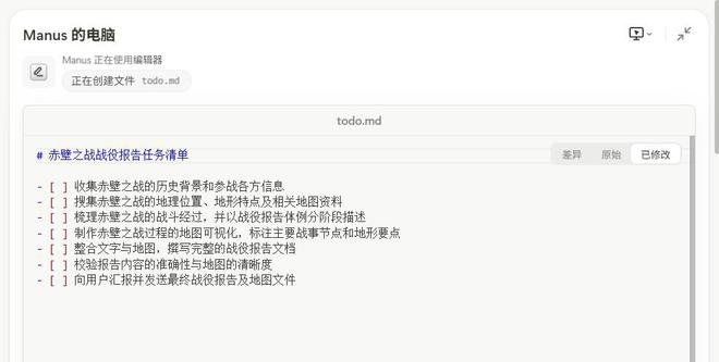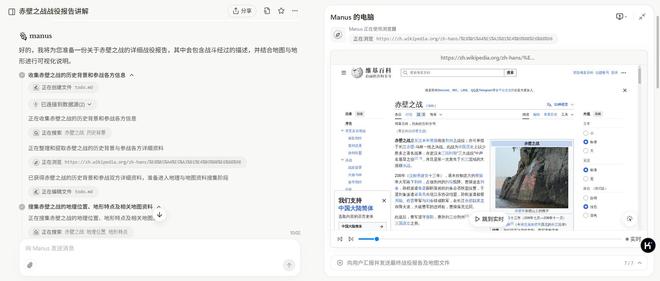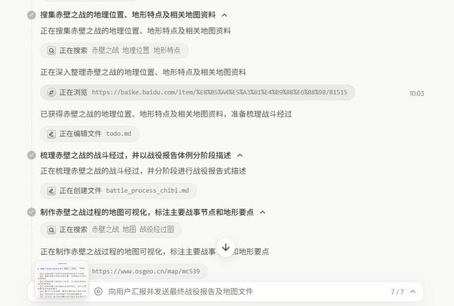 我首先问了一个重点在于信息整合方向上的问题,让Manus详细讲解一下赤壁之战,以报告的形式具体描述战斗经过,同时结合地图与地形可视化进行说明。