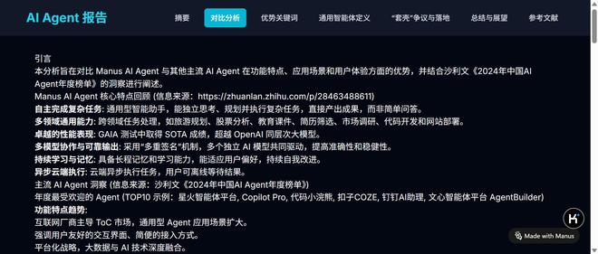 而这一次,我在prompt中其实并未提及需要帮我整合成一份完整报告,但Manus还是给我写了篇论文——包括了摘要和参考文献。