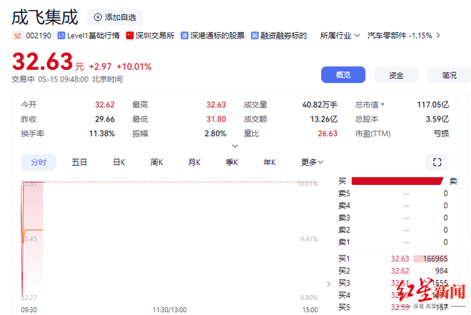 今日开盘,军工板块震荡拉升,成飞集成7连板,报32.62元/股,总市值117.05亿。