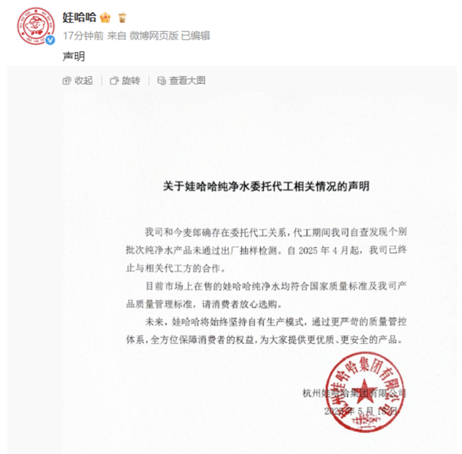 对此,娃哈哈发布关于娃哈哈纯净水委托代工相关情况的声明。声明表示:我司和今麦郎确存在委托代工关系,代工期间我司自查发现个别批次纯净水产品未通过出厂抽样检测。自2025年4月起,我司已终止与相关代工方的合作。目前市场上在售的娃哈哈纯净水均符合国家质量标准及我司产品质量管理标准,请消费者放心选购。未来,娃哈哈将始终坚持自有生产模式,通过更严苛的质量管控体系,全方位保障消费者的权益,为大家提供更优质、更安全的产品。