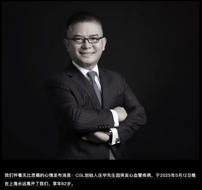 红星资本局5月15日消息,国内知名猎头公司CGL(上海德筑企业管理有限公司)发布讣告称,创始人庄华因突发心血管疾病,于5月12日晚在上海去世,享年62岁。离世当天,庄华还在和团队一起拜访客户。