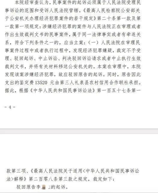 判决书称,基于上述原因,法院驳回原告起诉。同时,李平因此支出的鉴定费13520元由礼泉农信联社承担。