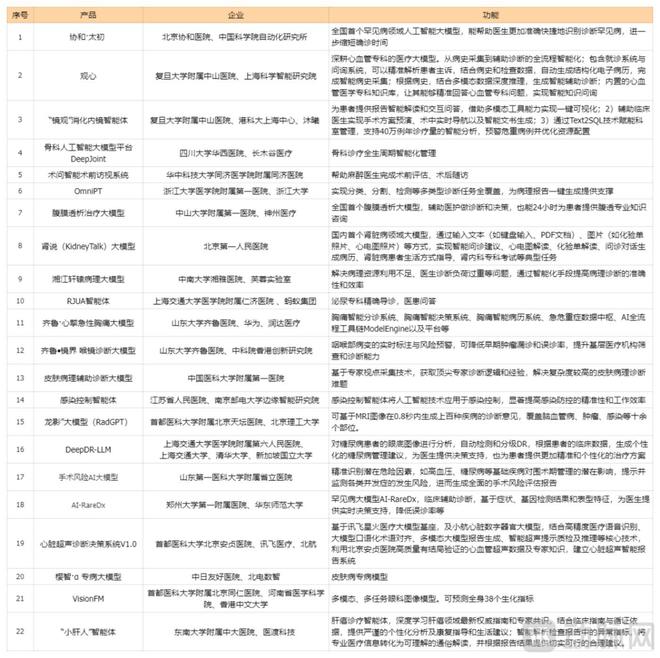 类似的垂直模型还有很多。动脉网据公开资料统计,国内目前已有专病专科垂直模型22个,覆盖心血管病、肾病、胸痛、咽喉病变、皮肤病、肝癌等病种,骨科、放射科、病理科、眼科、麻醉科等科室,甚至还专为消化内镜、心超等设备,以及手术风险评估、感染控制等环节训练大模型。