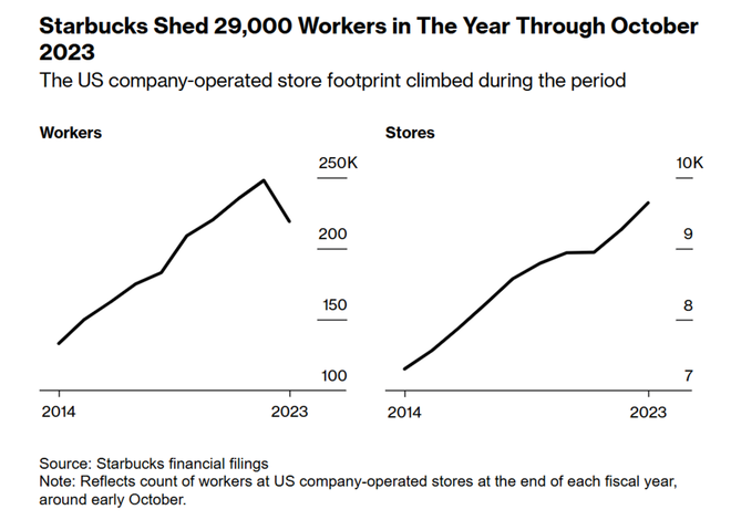 彼时的文件显示,截至2023年10月的一年里,星巴克新增了380家门店,但是在美国自营门店裁员2.9万人。