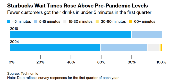 人手不足带来顾客等餐时间加长。Technomic的数据显示,2024年约有8%的星巴克顾客等待时间为15至30分钟,而2019年同期几乎没有人等待这么长时间。