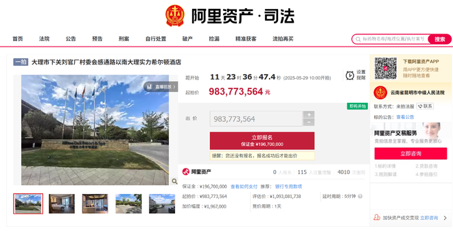 红星资本局5月17日消息,近日,阿里资产拍卖平台披露,大理实力希尔顿酒店将于5月29日进行拍卖。此次拍卖的评估价为10.93亿元,起拍价为9.83亿元,相当于打了9折。截至发稿,此次拍卖共115人设置提醒,超4000次围观,暂无人报名。