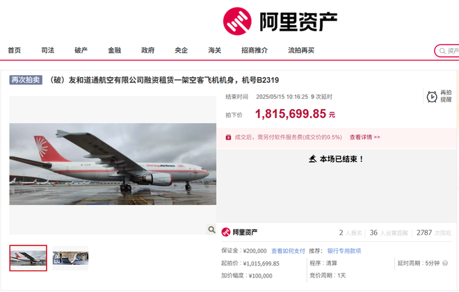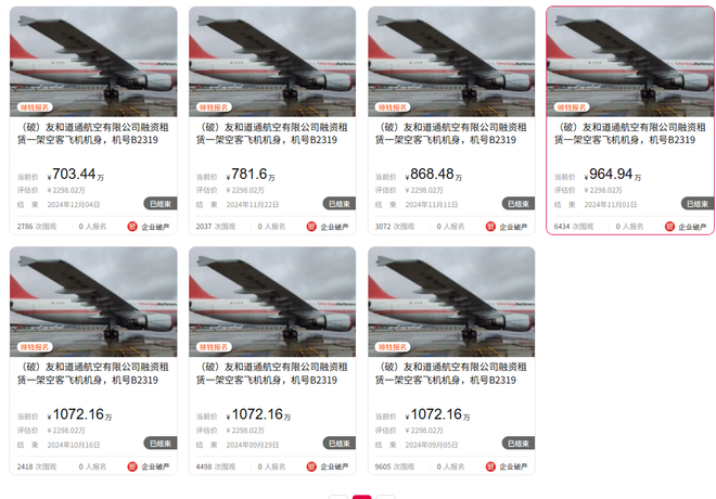 2024年9月,注册号为B2319的空客飞机机身首次进行拍卖,评估价为2298.02万元,起拍价为1072.16万元,但无人报名;此后,起拍价一路下降,但仍无人报名,共流拍18次。