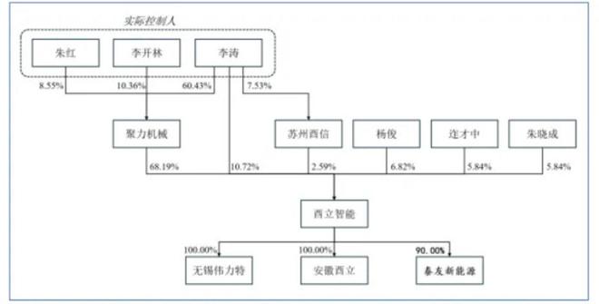 招股书显示,酉立智能前三大股东分别是江苏聚力智能机械股份有限公司(以下简称“聚力机械”)、李涛、杨俊,持股比例分别为68.19%、10.72%、6.82%。