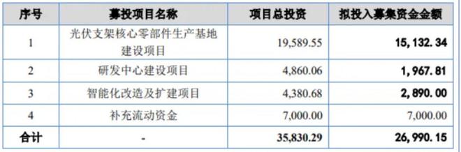 本次上市,公司将募集资金2.70亿元,主要用于光伏支架核心零部件生产基地建设项目、研发中心建设项目、智能化改造及扩建项目、补充流动资金等。