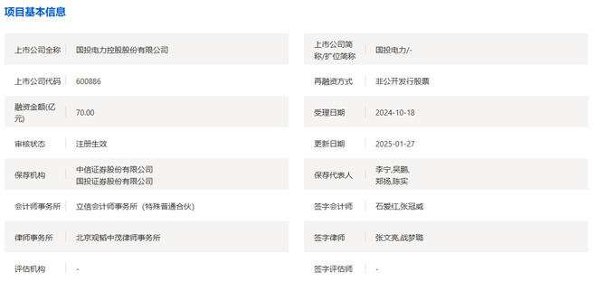 上交所网站显示,国投电力主板再融资项目于2024年10月获得受理,于今年1月22日获得证监会同意注册批复。该项目的保荐机构有两家,分别是中信证券和国投证券,保荐代表人有四名,分别为李宁、吴鹏、郑扬、陈实。