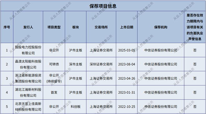 以中信证券保代李宁为例,中证协网站显示,李宁于2019年登记为保荐代表人,此后负责过14个保荐项目,包括4个首发、6个非公开和4个可转债项目,涉及天宜上佳(688033.SH)、浙江新能(600032.SH)、国投电力(600886.SH)等公司。最近的一个项目是国投电力的非公开发行股票项目,于今年3月5日完成。