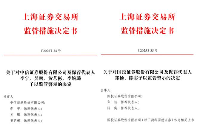 上交所表示,中信证券、国投证券未及时向该所报告上述情况,出具的核查意见与实际情况不符,履行保荐职责不到位,项目保代对此负有直接责任。因此,上交所对中信证券及四名保代李宁、吴鹏、黄艺彬、李婉璐予以监管警示,对国投证券及两名保代郑扬、陈实予以监管警示。