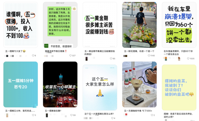 然而,在市集摆摊从来不是一件轻松的事,虽然也有摊主在社交平台上发帖表示摆摊三天收入超过五万、日入四位数,但大多数的摊主需要直面的是暴晒雨淋一整天但日均收入不超过百元的残酷现实。今年的五一黄金周里,有不少在市集摆摊的摊主在社交平台上纷纷发帖吐槽收入甚微,入不敷出,甚至“有的连摊位费都没赚回来”。