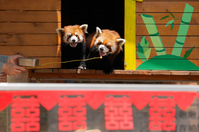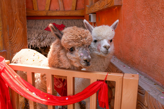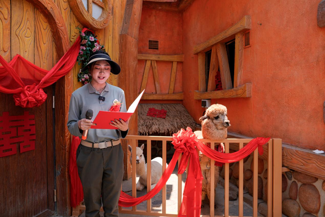 在贴满朱红喜字的典礼现场,游客们手持胡萝卜"份子钱"挤在栅栏外翘首以盼。毛茸茸的羊驼夫妇"羊羊"和"驼驼"顶着刺绣小领结,在它们的爱巢里表演贴脸杀,惹得举着手机的游客笑嚷"甜度超标啦"。活泼可爱的矮马、绵羊等小动物也趁机溜达过来观礼。园区顶流网红小熊猫"贝贝""佑佑"这对新人也在游客的见证下亮相互动,保育员代读的魔性誓言更是引爆全场笑点。
