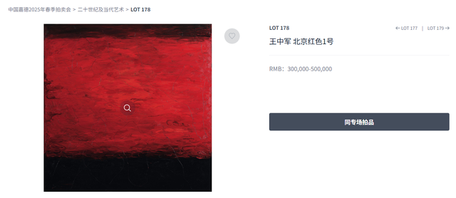 5月13日,在中国嘉德2025年春季拍卖会的二十世纪及当代艺术场次上,王中军的《北京红色1号》是拍品之一,估价为30万元至50万元,但未能成交。