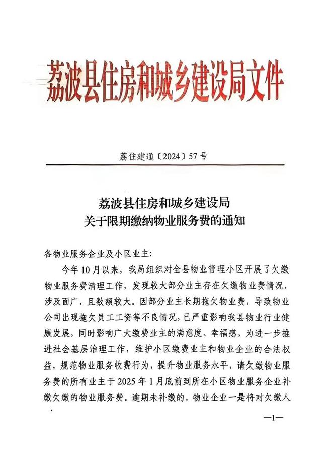 《通知》称,当年10月以来,该局组织对全县物业管理小区开展了欠缴物业服务费清理工作,发现较大部分业主存在欠缴物业费情况,涉及面广,且数额较大,要求欠缴物业服务费的所有业主于2025年1月底前到所在小区物业服务企业补缴欠缴的物业服务费。
