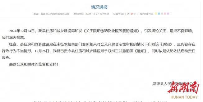 荔波县住建局曾发布物业费催缴通知,后被撤销并问责