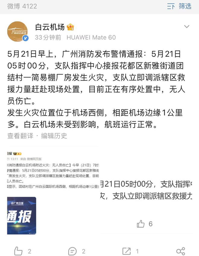 红星资本局5月21日消息,今日,白云机场(600004.SH)发文称,发生火灾位置位于机场西侧,相距机场边缘1公里多。白云机场未受到影响,航班运行正常。