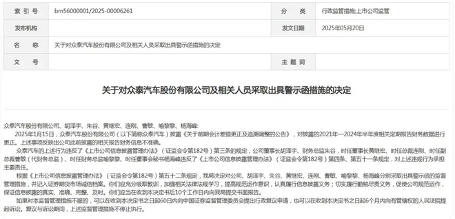 红星资本局5月21日消息,昨日,浙江证监局发布关于对众泰汽车(000980.SZ)股份有限公司及相关人员采取出具警示函措施的决定。