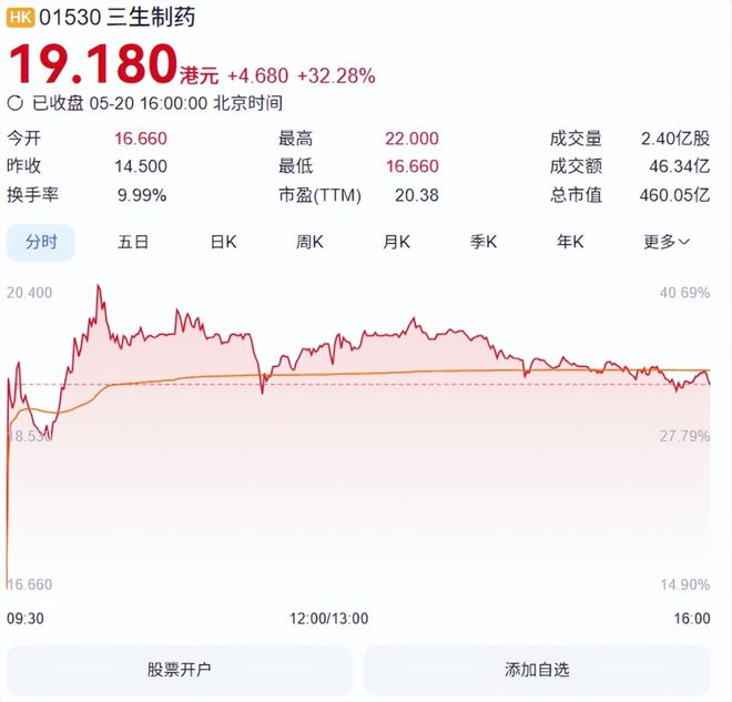 截至今日收盘,三生制药股价报19.18港元/股,上涨32.28%,成交额达46.34亿港元,总市值达460.05亿港元。这背后,一笔授权交易在给三生制药增光添彩。