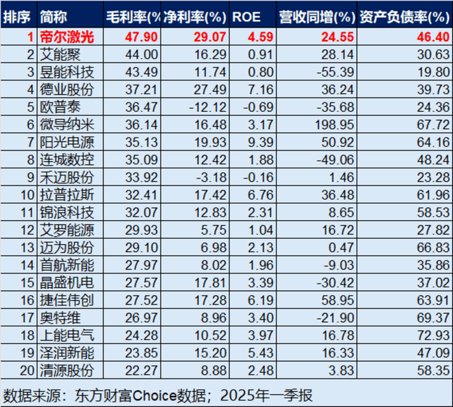 光伏主材辅材都血亏,但设备、逆变器企业日子还过得去,至少目前如此,30%以上的毛利率是常态。帝尔激光的毛利率更高,2024年干到了46.87%,今年1季度更是达到47.9%。赶碳号用东财Choice拉了一下,在所有光伏企业中,帝尔激光的毛利率、净利率是最高的!