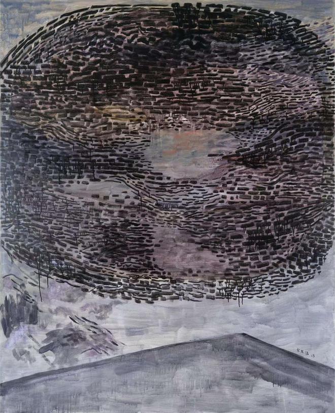 余友涵于1984年开始“圆系列”的创作,通过其隐喻世界和宇宙的某种恒常本质。2010年前后,经过波普风格的创作时期,余友涵再次回归到“圆”这一母题。在这幅展品面前,观众能看见丰富但克制的彩色基底。画面中庞大的圆形由细密的笔触和书写构成,源于艺术家对于宋元以来山水画传统的融汇运用。画面下方的形状犹如方的一角、山的峰峦、田地的一隅,与“圆”形成和谐相视的对话,两者共同构筑了囊括万物的天地方圆,也传达出方与圆、虚与实、凹与凸、一瞬与永恒间相依相转的辩证之美。