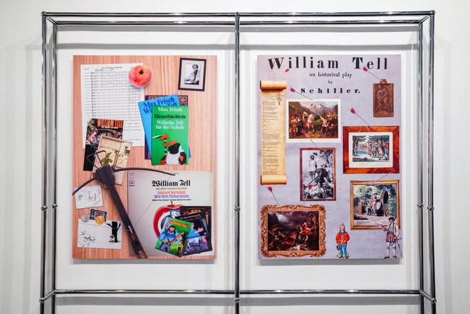 澎湃新闻记者注意到瑞士使馆展位位于本届展会核心区域,以“身份、叙事与象征”为主题,特邀瑞士艺术家米里亚姆·劳拉·莱昂纳迪(Miriam Laura Leonardi)全新创作了融合文学、历史与科技元素的装置作品系列。该作围绕瑞士民族英雄威廉·退尔(William Tell)的传说,包括以文学作品为灵感的海报、装有爆炸苹果的景德镇瓷盘、激光雕刻苹果以及AR互动体验四部分。艺术家通过作品重新诠释象征意义极强的苹果意象,将其与日常物件结合并赋予新功能,从而引发关于神话、历史叙述与现实“真相”的深度思考。