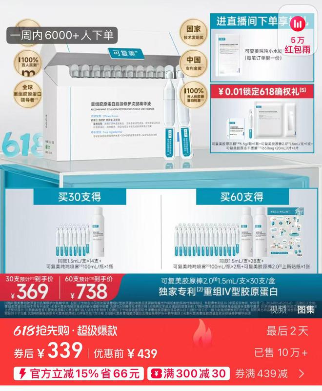 郝宇视频中质疑的产品也是可复美的王牌产品。红星资本局注意到,该产品在天猫旗舰店显示价格为券后339元(30支),已售10万+。