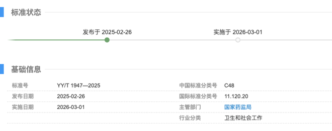 全国标准信息公共服务平台显示,YY/T 1947-2025《重组胶原蛋白敷料》行业标准发布于2025年2月,但还未实施,实施日期为2026年3月。资料显示,本文件规定了重组胶原蛋白敷料的要求、标志及包装,描述了相应的试验方法。