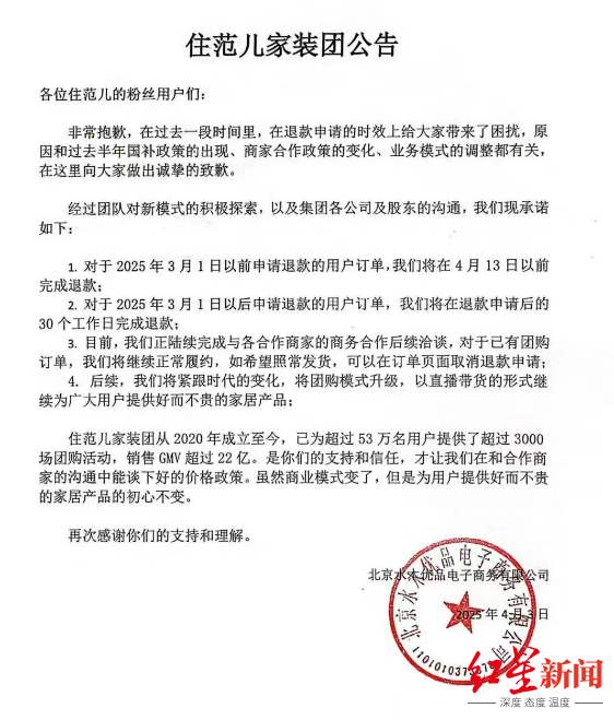 红星资本局采访了解到,住范儿平台曾借助“囤货”功能预收消费者货款。今年3月份,住范儿开始出现退款进度缓慢的情况,随着此事在社交媒体发酵,更多用户申请退款。住范儿工作人员透露,曾计划申请一笔银行贷款缓解退费压力,但银行要求补充更多材料。目前住范儿采取排队退费的方式,不过,有消费者向红星资本局表示,退款计划已面临停滞。