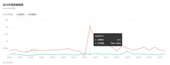 今年4月23日,与辉同行正式实现了对东方甄选粉丝量的反超。截至发稿前,与辉同行抖音账号粉丝已攀升至2914.3万,东方甄选则为2851万,两者相差60多万。据蝉妈妈数据显示,近30天来,与辉同行的日均带货GMV数据大多都是东方甄选的3—10倍。