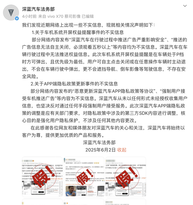 深蓝汽车法务部还表示,部分网络内容发布的“恶意更新深蓝汽车APP隐私政策等协议”“强制用户接受车机推送广告”等内容为不实信息。深蓝汽车从未以任何形式未经授权收集用户信息,此次深蓝汽车APP端隐私政策的调整是应有关部门要求,对隐私政策中涉及的第三方SDK内容进行调整,目的是强化用户隐私保护,不涉及任何其他内容更改。