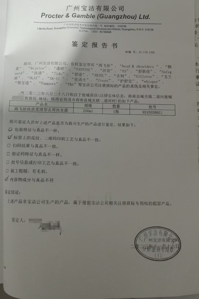 田女士提供的法院传票显示,田女士名下小商店所涉及侵害商标权纠纷案将在2025年6月10日上午开庭。在一份原告提供的鉴定报告书中载明,原告于2023年6月28日在田女士父母经营的小商店中购得规格为200毫升装的海飞丝丝质柔滑型去屑洗发露一瓶。报告称,该司鉴定人员对上述产品是否为其公司生产的产品进行鉴定,结果为包装特征与真品不一样;标签上的花纹、二维码印刷工艺与真品不一致;内容物成分与真品不符。并最终结论为:上述产品非宝洁公司生产的产品,属于侵犯宝洁公司相关注册商标专用权的假冒产品。