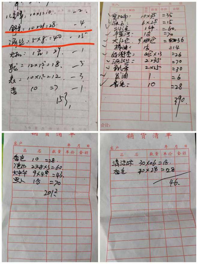 田女士向记者提供了数张来自多个小商店的进货凭证,但上面几乎没有相应的供货商信息,所进货物也均以简写的手写方式呈现,比如舒肤佳香皂多以“舒皂”或“皂”字样出现,而海飞丝则直接简化成“海丝”。