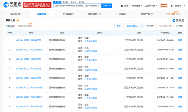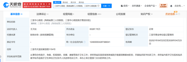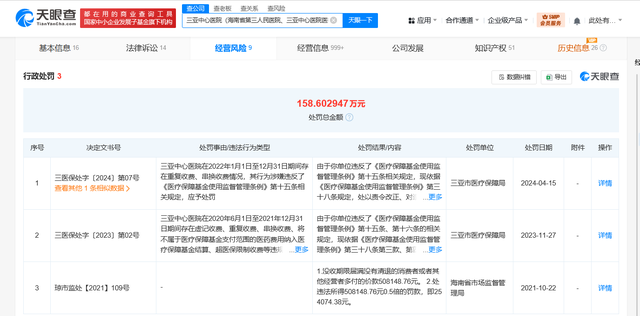 天眼查App显示,三亚中心医院法定代表人为王天松,开办资金约8.3亿人民币,宗旨和业务范围含从事综合性医疗、急救、疾病预防、保健、康复等医疗卫生工作。风险信息显示,该医院曾多次因医疗损害责任纠纷被起诉。此外,2023年11月、2024年4月,该医院曾因重复收费、串换收费等行为,违反《医疗保障基金使用监督管理条例》,分别被三亚市医疗保障局罚款55.9万元、102.6万元。