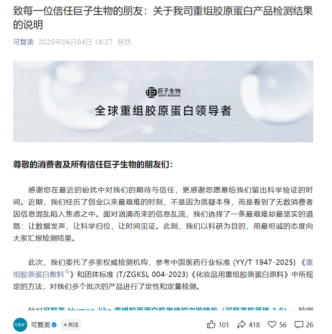 今日下午,巨子生物在可复美微信公众号发文称,此前委托多家权威检测机构对争议产品的检测结果出炉,可复美相关产品中真实添加重组胶原蛋白成分,不存在网传的“虚假宣传、误导消费者”行为。