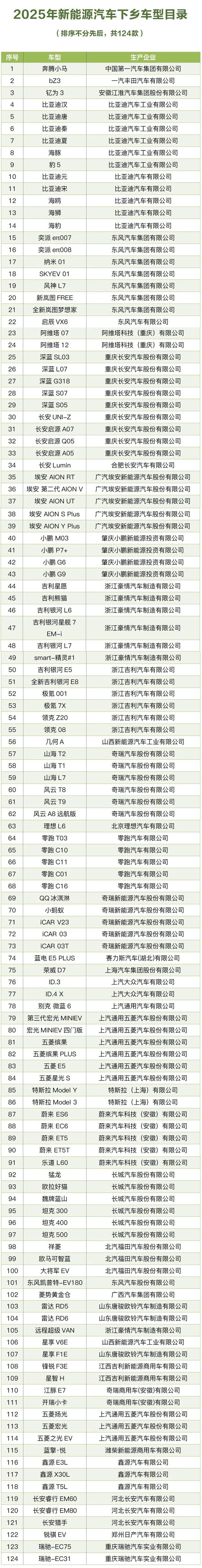 五部门启动2025年新能源汽车下乡活动!共124款参与车型