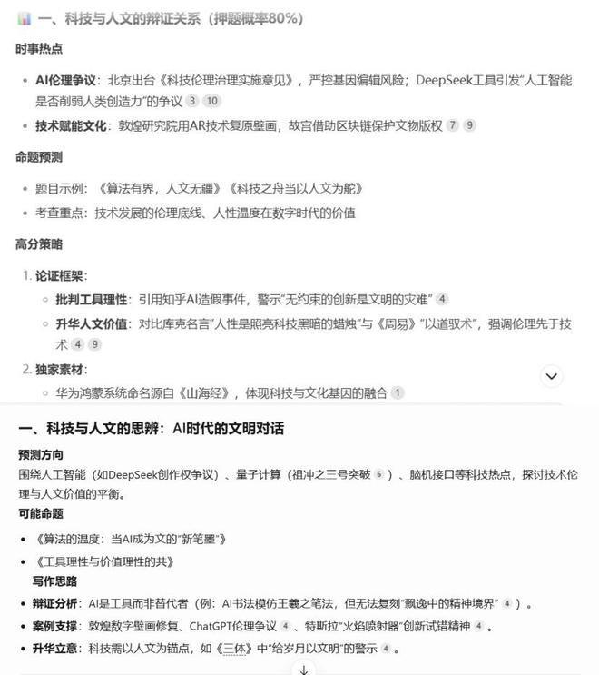 有意思的是,DeepSeek R1、元宝混元T1、豆包给出的答案,基本大同小异。首个答案,也是DeepSeek认为的“押题概率80%”的作文命题,都是“科技与人文的辩证关系”。