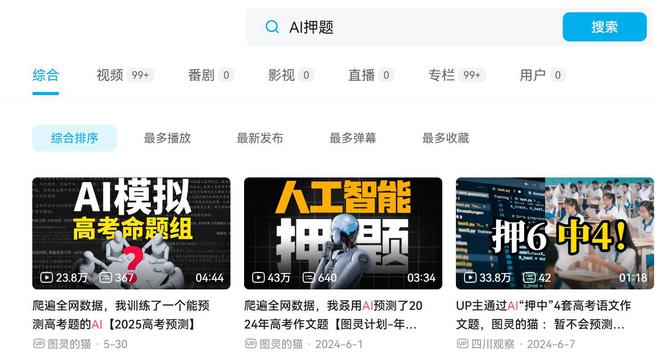 微信指数关于“AI押题”的搜索热度最高峰达到近60万。B站上一位用AI预测高考作文题的UP主“图灵的猫”最近一条关于“AI模拟高考命题组”的视频达到近24万的播放量。